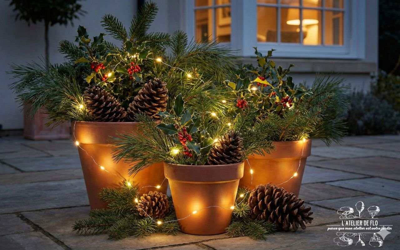 • Le pouvoir du pot : Sur votre terrasse, regroupez vos pots vides. Remplissez-les de branches de sapin, de houx, de pommes de pin glanées en forêt verte, et ajoutez une simple guirlande LED à piles (blanc chaud !). Effet « magazine déco » garanti en 5 minutes chrono.