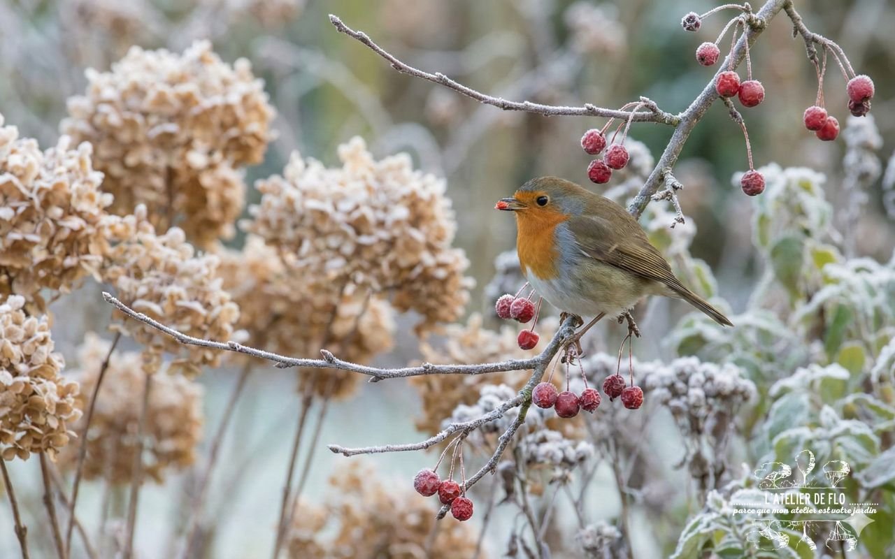 L’astuce de l’Atelier de Flo : Envie de planter utile ? Pensez au Pommier d’ornement (Malus). Ses petites pommes rouges restent accrochées tout l’hiver : c’est déco pour vous, et délicieux pour les oiseaux.