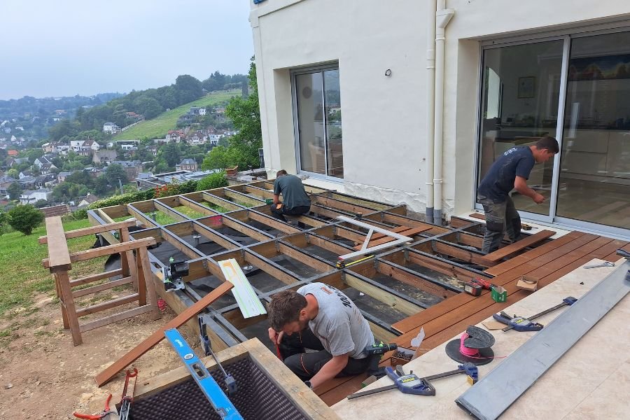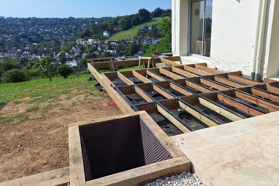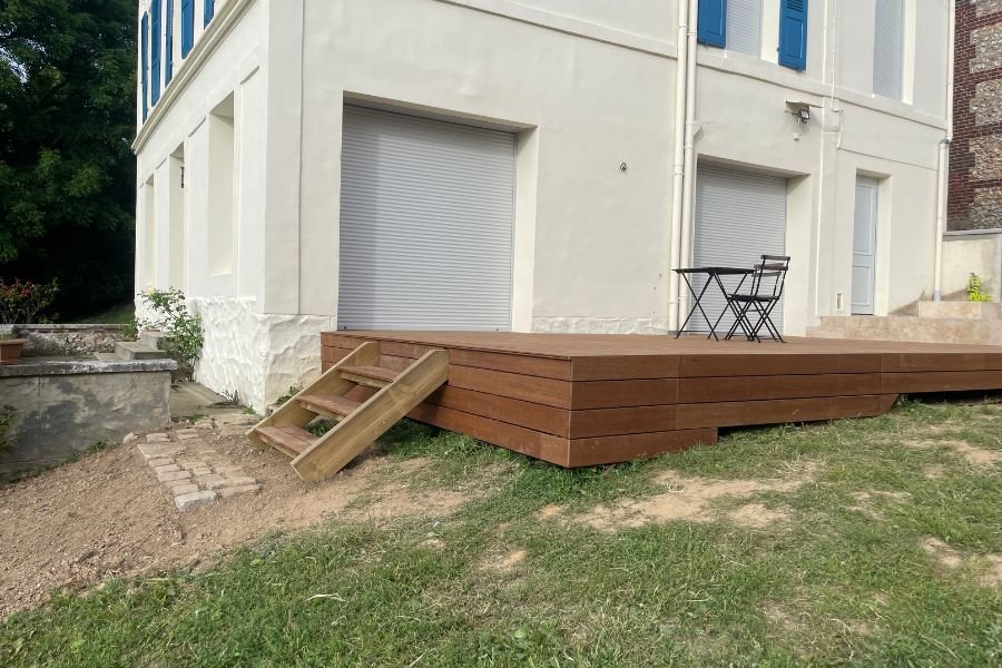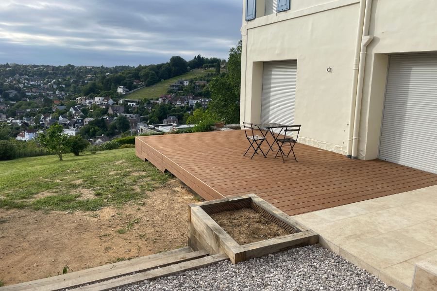 Nous avons eu le plaisir de concevoir et poser cette terrasse en bois sur mesure, pensée pour s’intégrer harmonieusement au jardin de nos clients. Alliant esthétisme chaleureux et robustesse, ce nouvel espace de vie invite à la détente dès les premiers rayons de soleil.